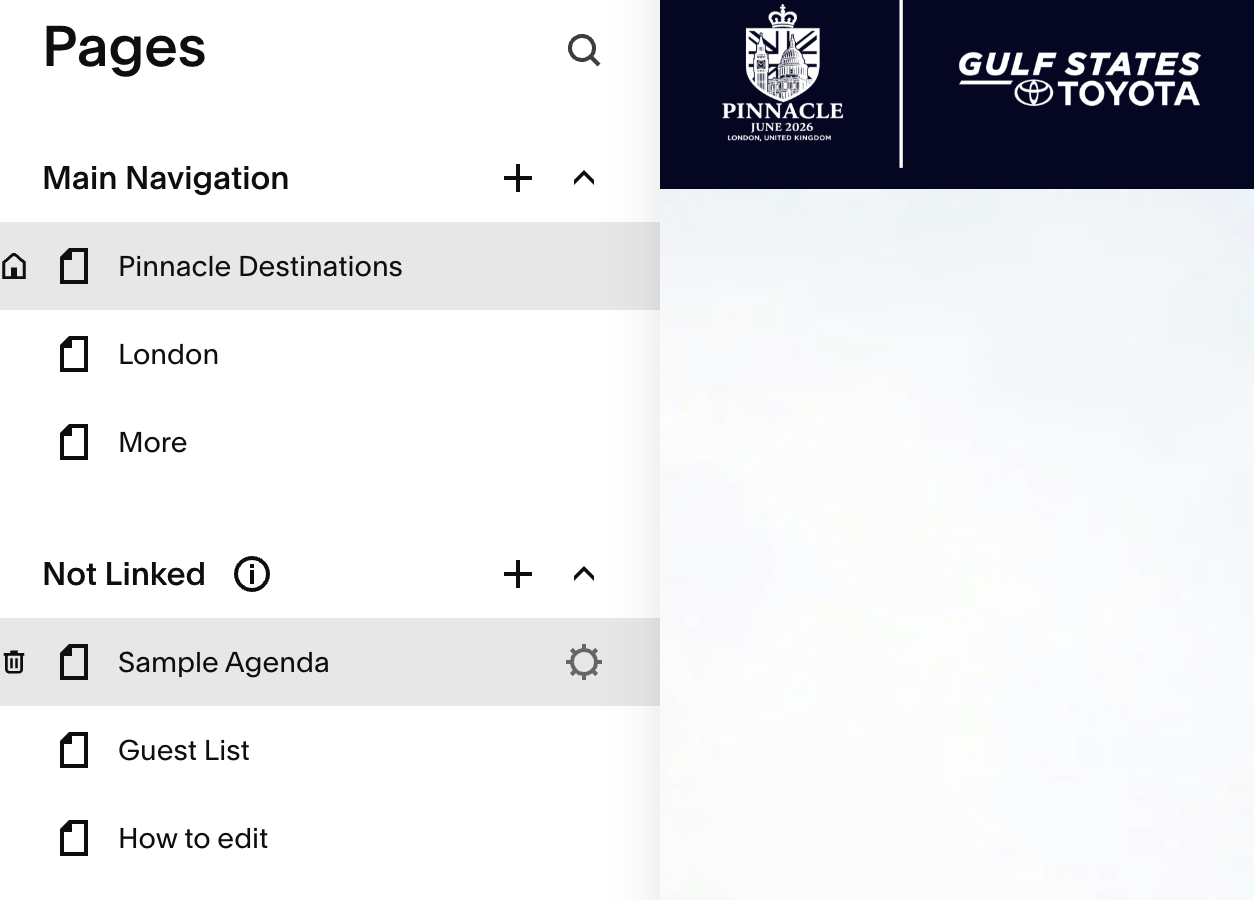 5. Still in the left-hand column, click on the page you wish to edit - in this case, Sample Agenda, then click on the gear icon to the right.