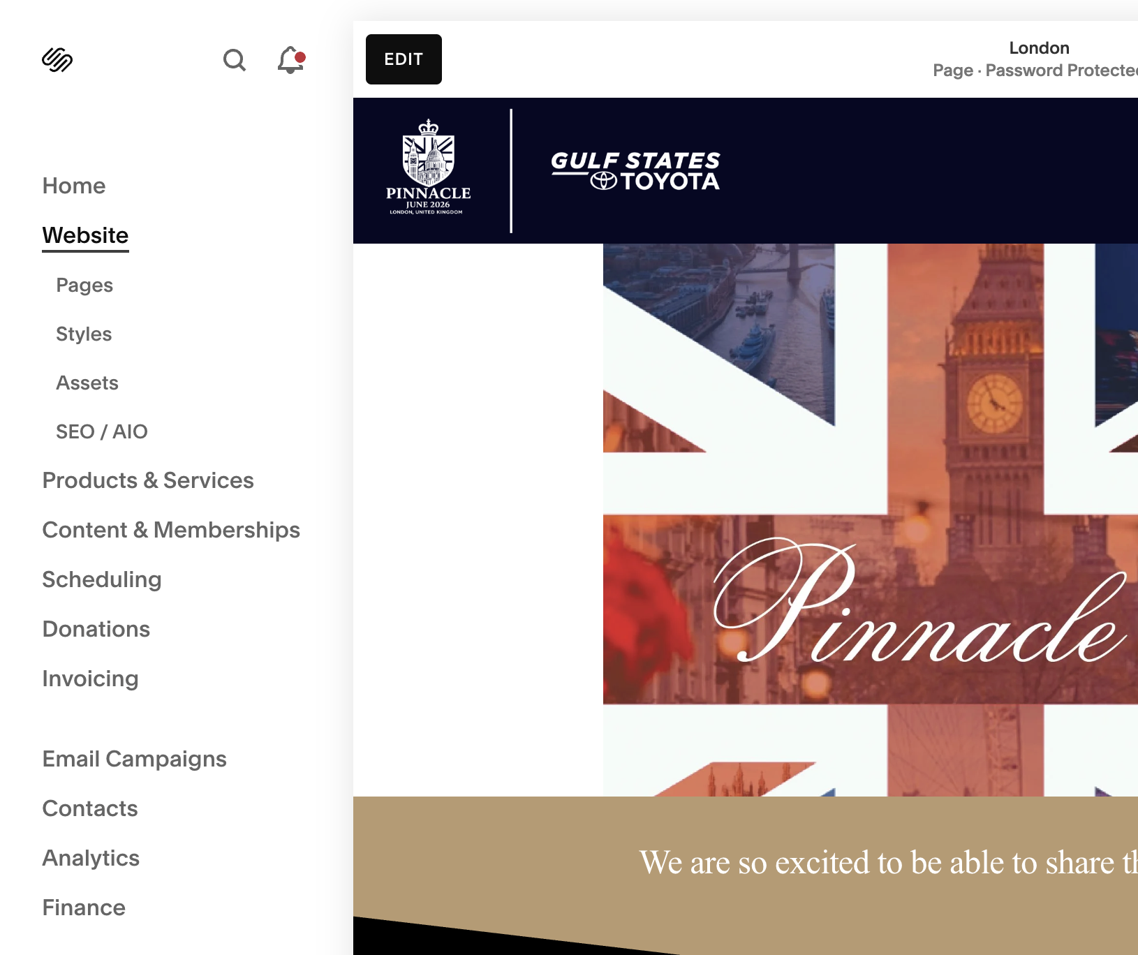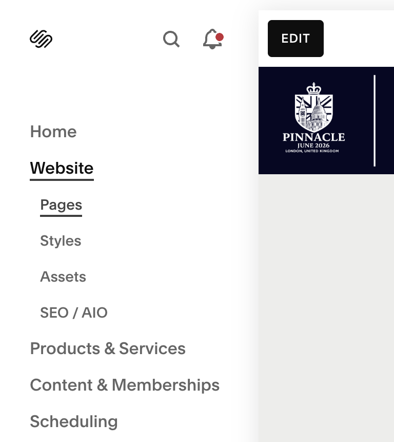 4. Click on Pages, then click on the page you wish to access, then click on the Edit Button at the top left of the site screen