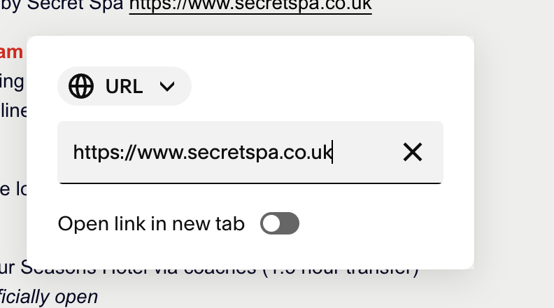 4. In the grey box under URL, type or paste the url you would like the link to take you to. If the link goes to a website that is not the Pinnacle site, toggle “Open link in new tab” on (green) so that guests do not lose their place in the Pinnacle site. Once edits are complete, in the upper left hand corner, click Save then Exit.