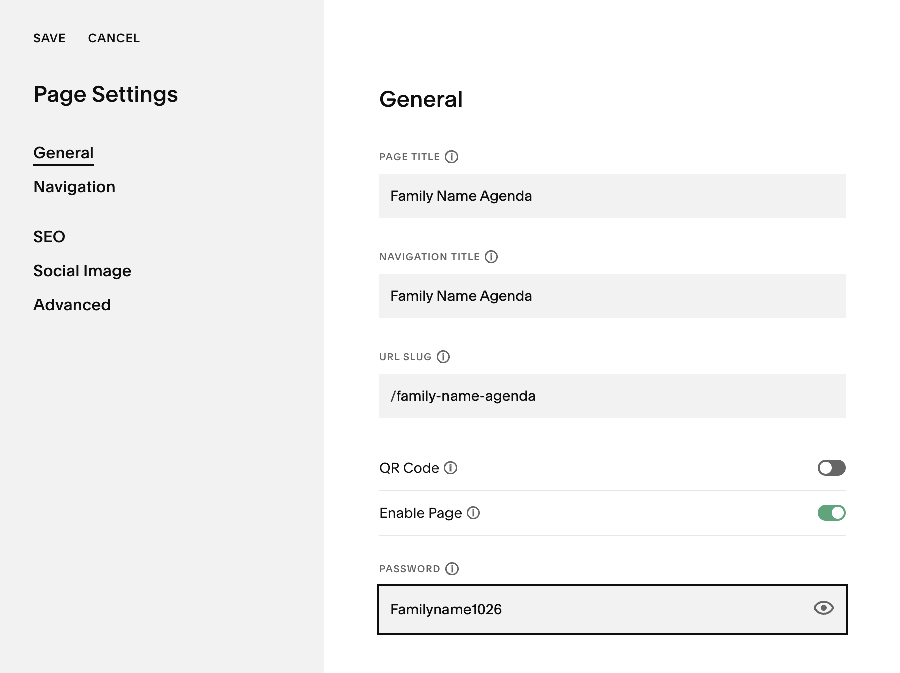 URL slug > /family-name-agenda (note that this is all lowercase, and spaces are replaced with dashes)