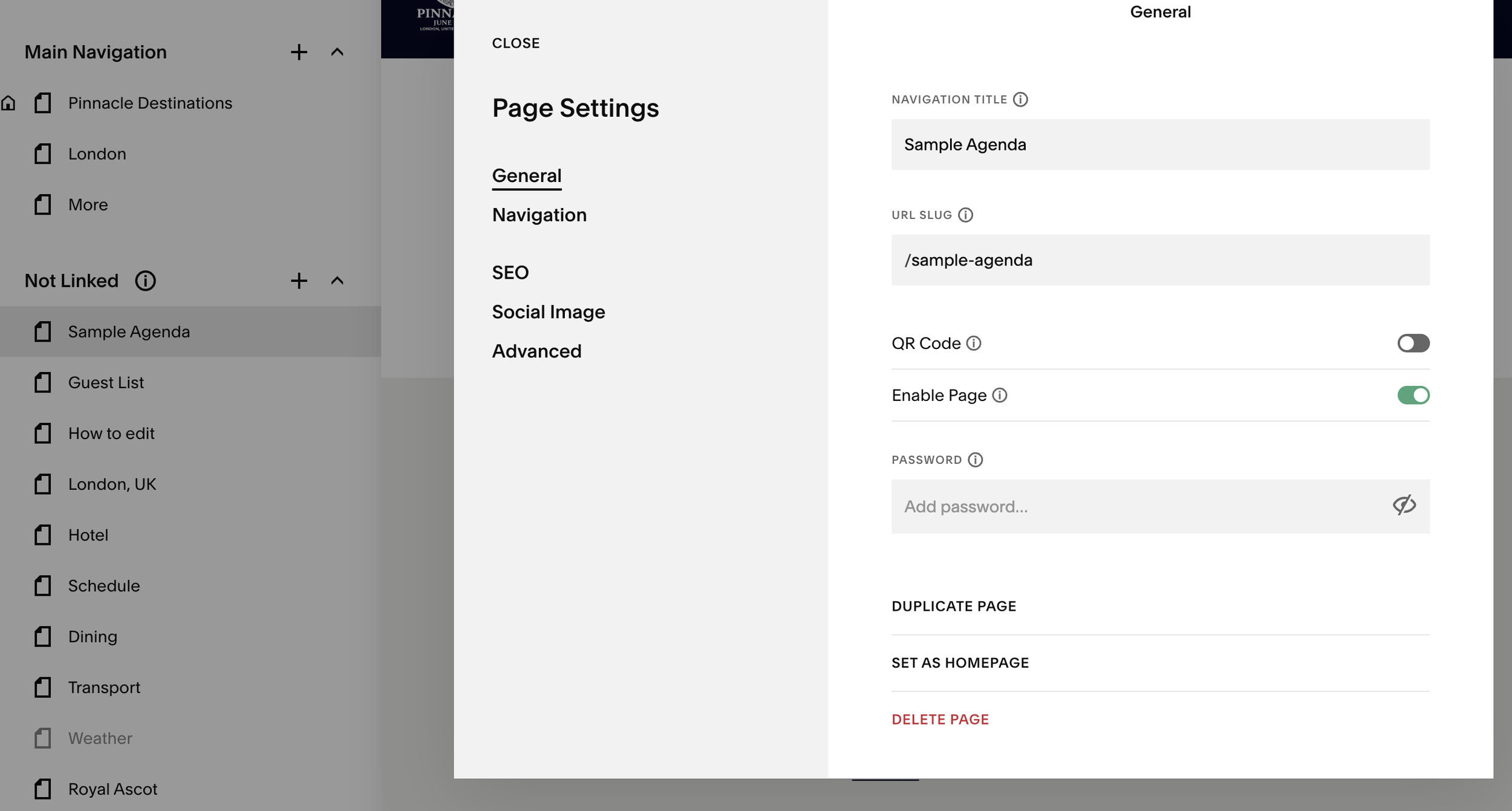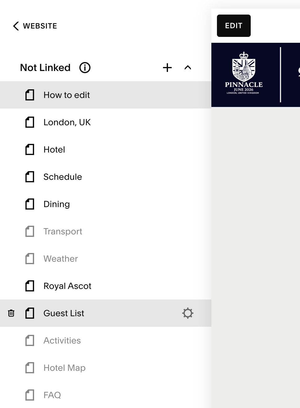 5. Still in the left-hand column, click on the page you wish to edit - in this case, Guest List.