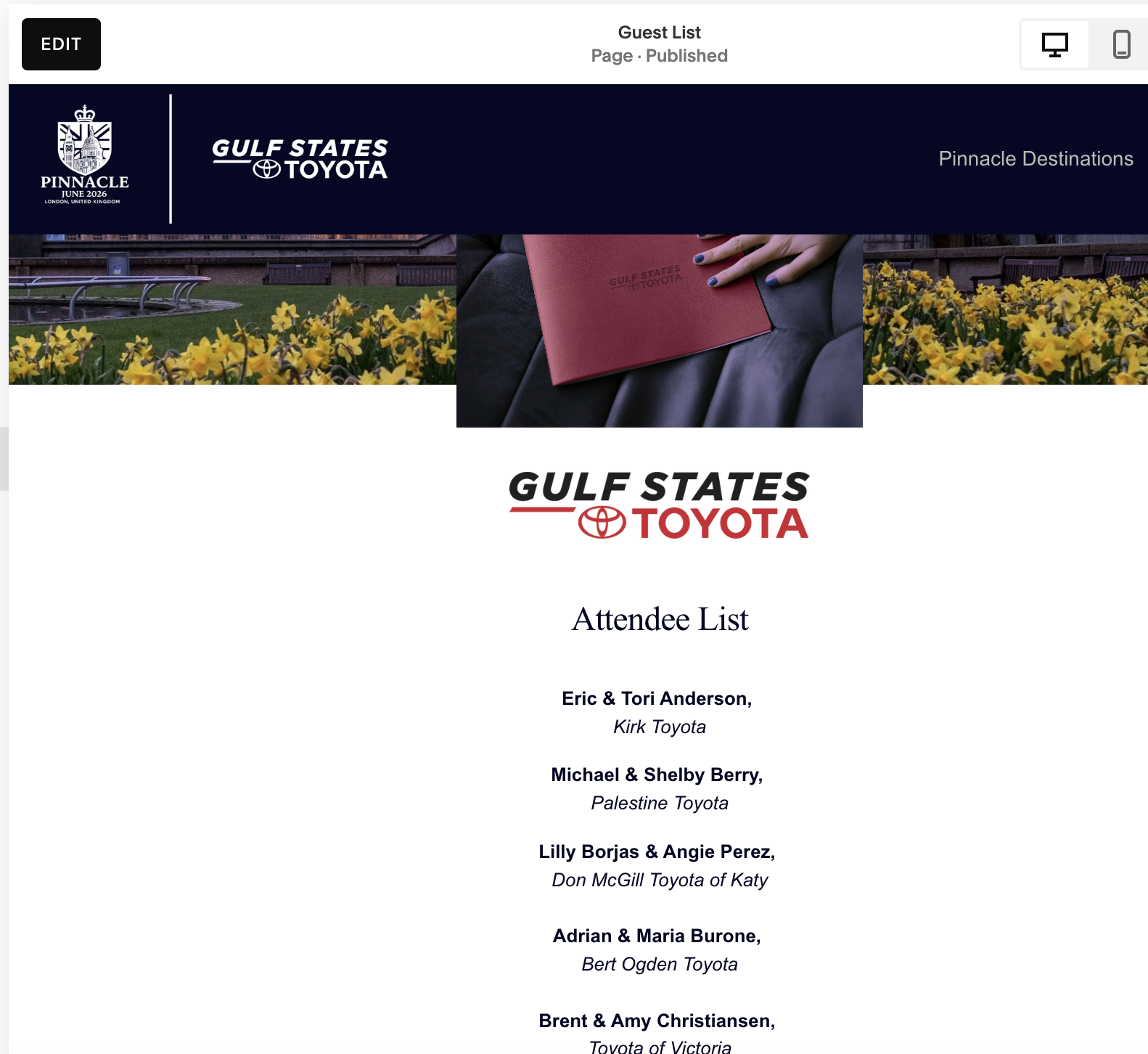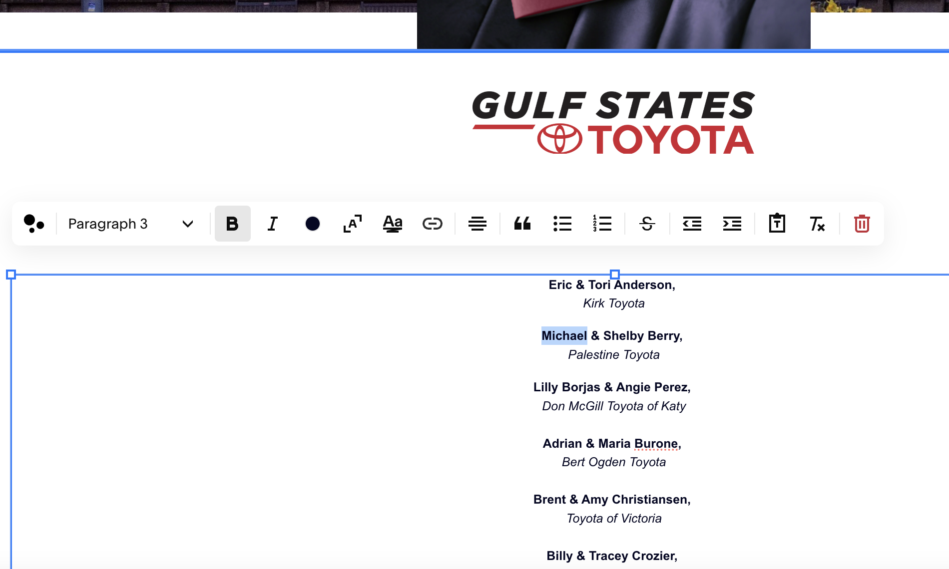 7. Scroll down to the guest list and click on the pencil icon. Click on the text you wish to edit. An editing bar will pop up above the type box. This type should be Paragraph 3, Bold and Italic. Between names and dealership, hit Shift-Return for a single spaced break. Between dealership and next entry, hit Return for a larger spaced break. As you type, the type box will expand accordingly, or reduce accordingly, so you don’t need to change the actual box the type is in. Once edits are complete, in the upper left hand corner, click Save then Exit.
