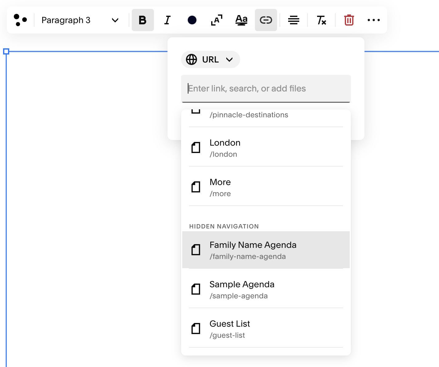 9. To link the agenda to the appropriate name on the Guest List page, first select Guest List from the pages on the left side menu. Click Edit, then highlight the Guest Name entry, click on the link icon in the edit bar, and select the page with the appropriate agenda title. For detailed steps, see “How to add a Live Link” section above.